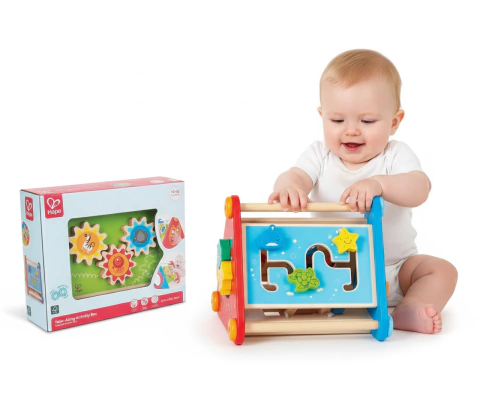Esta caja de actividades con 5 lados incluye engranajes, bolas, bloques y un laberinto; además de colores, múltiples movimientos y un espejo.